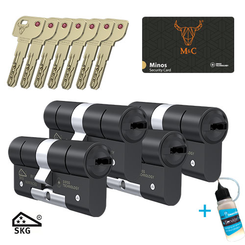 De sleutels van de M&C Minos zijn gepatenteerd tegen ongeoorloofd kopiëren. Deze zijn ook extra beveiligd door middel van een verhoogd profiel. Bij elke set wordt een certificaat geleverd waarmee je bij een geautoriseerde dealer sleutels en,of cilinders kunt laten bijmaken. M&C Minos is beveiligd tegen boren, openpikken, kerntrekken, de slagmethode en de impressietechniek. Deze cilinder heeft bovenop het SKG 3* keurmerk ook nog een hardstalen brug waarbij het bijna onmogelijk is om de cilinder te breken – zelfs zonder deurbeslag. In de volksmond wordt veel gesproken over het kerntrekken. Maar in de praktijk wordt vaak de cilinder gebroken waardoor de deur gemakkelijk geopend kan worden (ook voor 3-puntsluitingen). Bij aanschaf van een SKG 3* cilinder hoeft de cilinder nog niet beveiligd te zijn tegen het breken van de cilinder. Daarvoor is dan weer het kerntrekbeslag wat niet nodig is bij deze deurcilinders met extra stalen brug.