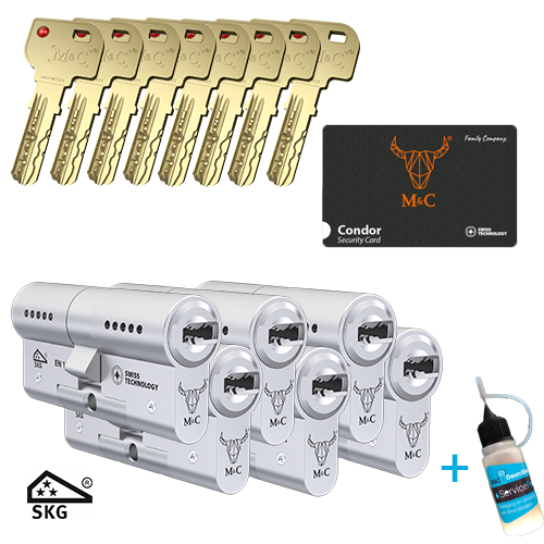De M&C Condor cilindersloten zijn voorzien van een gehard stalen brug die de cilinder beschermt tegen boren en het breken van de cilinder. Het slot heeft ook boorbeveiliging en een anti-slagpickfunctie, waardoor het zeer moeilijk is voor inbrekers om het slot te manipuleren.