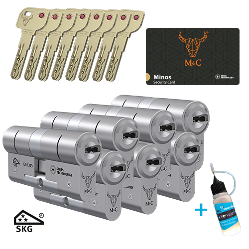 De M&C Minos cilindersloten zijn voorzien van SKG 3 keurmerk, een gehard stalen brug die de cilinder beschermt tegen het breken van de cilinder en een extra boorbeveiligingselement bovenop de standaard boorbeveiliging. Het slot heeft ook een anti-slagpickfunctie, waardoor het zeer moeilijk is voor inbrekers om het slot te manipuleren.